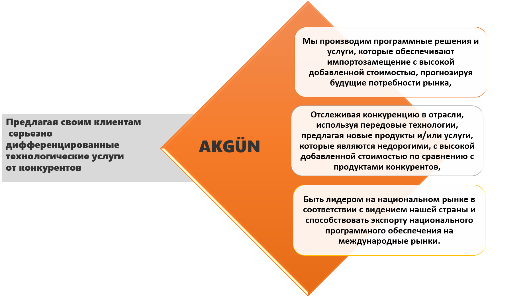 АКГЮН измеряет и оценивает проектные идеи с добавленной стоимостью, которую он принесет компании, существующим клиентам и нацеленным на новые рынки, чтобы укрепить свое лидерство в секторах, в которых он работает, расширить свой ассортимент продукции, постоянно улучшать существующие продукты, выходить на новые рынки и поддерживать бизнес-модель, которую он определяет. В этом контексте усилия АКГЮН (оригинальность, качество, низкая стоимость и т.д.) Сосредоточены на инновациях продукта / услуги (улучшение процесса, улучшение продукта, адаптация к потребностям клиента, адаптация к стандартам в секторе, создание нового подхода к обслуживанию и т.д.).
